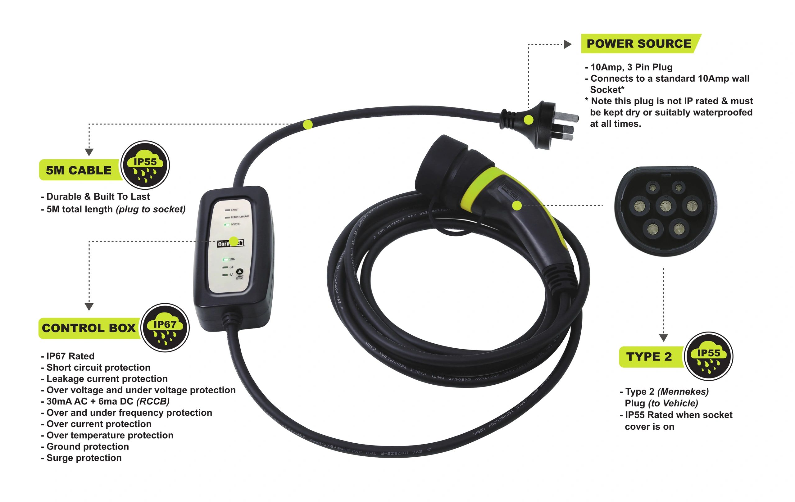 This portable Electric Vehicle charger plugs directly into a standard 10Amp wall socket*